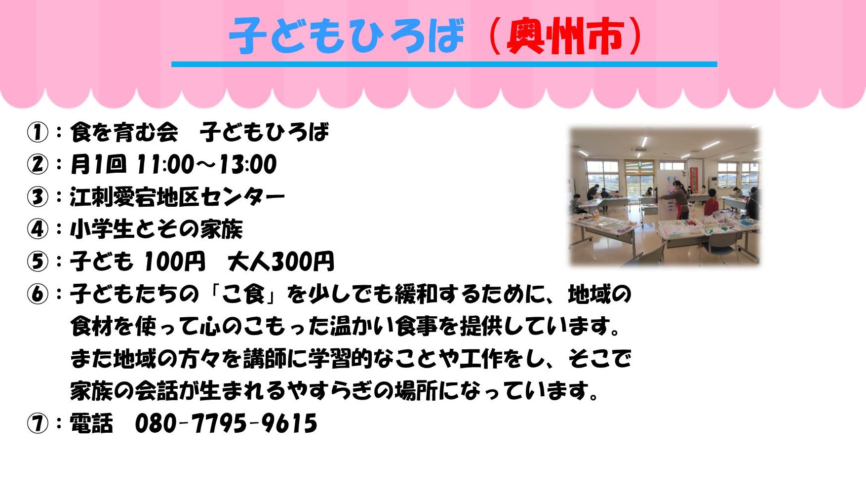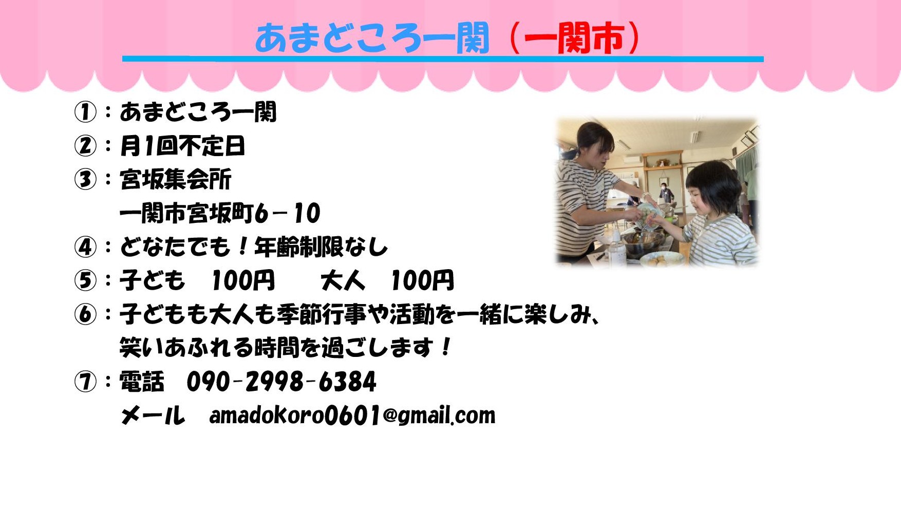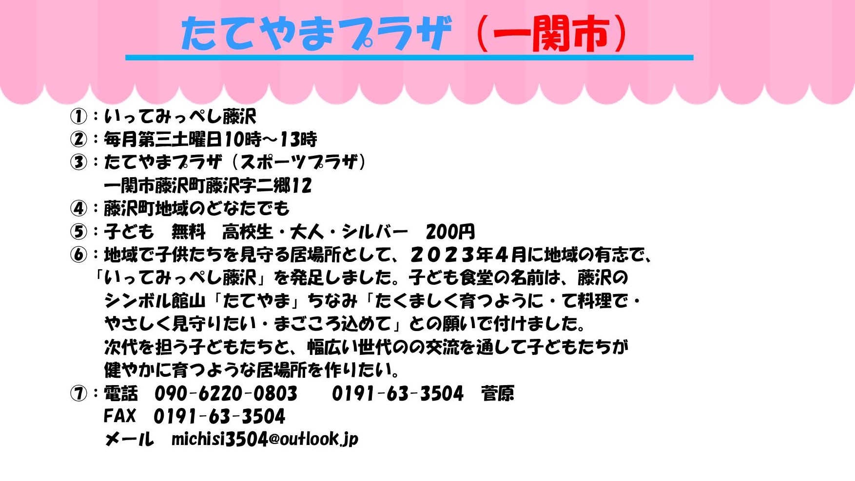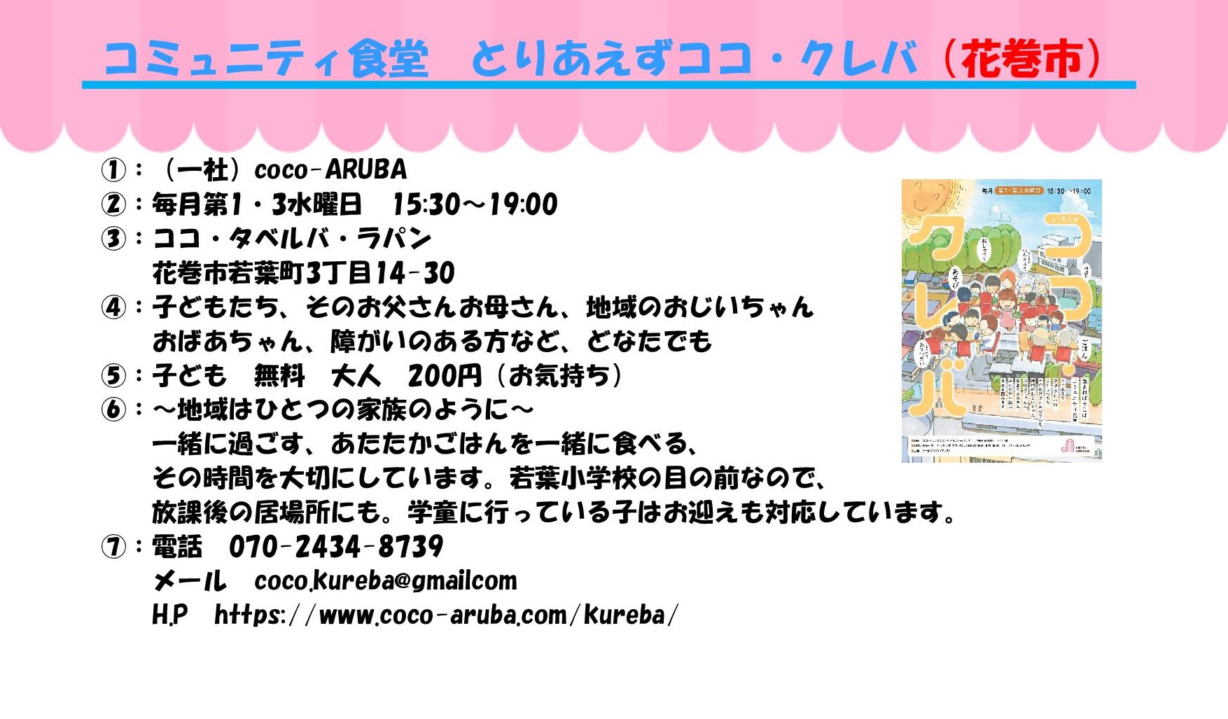 ①実施団体 ②開催日と時間 ③場所 ④対象 ⑤参加費 ⑥ひとこと ⑦問い合わせ