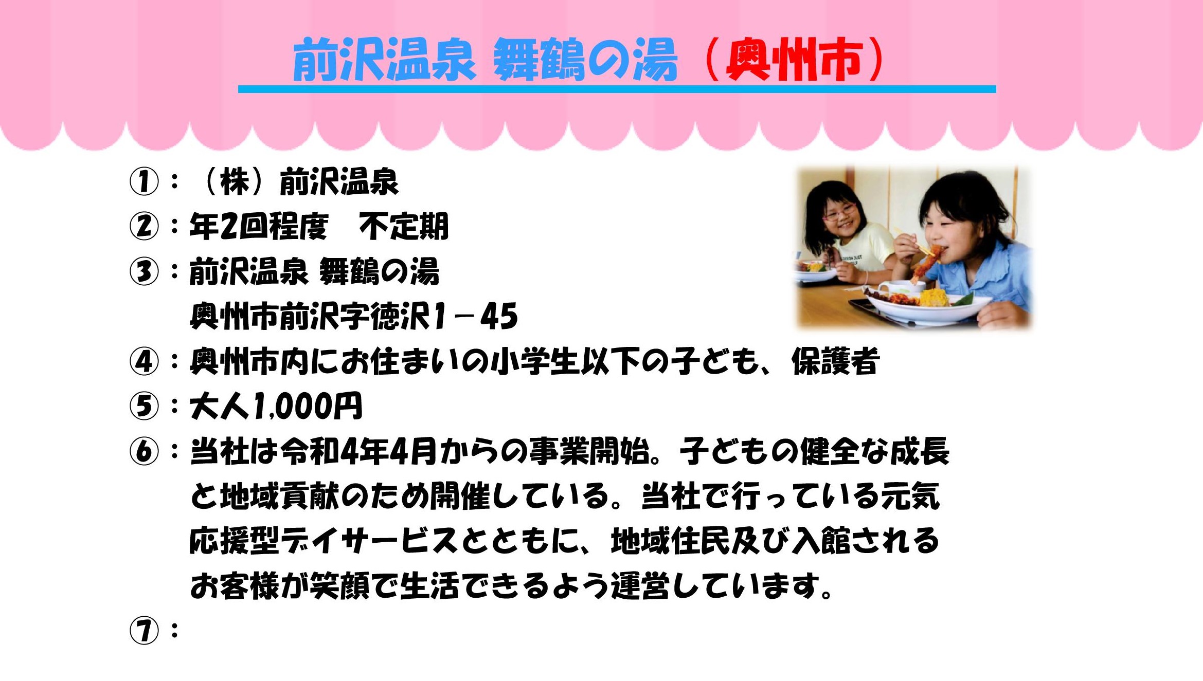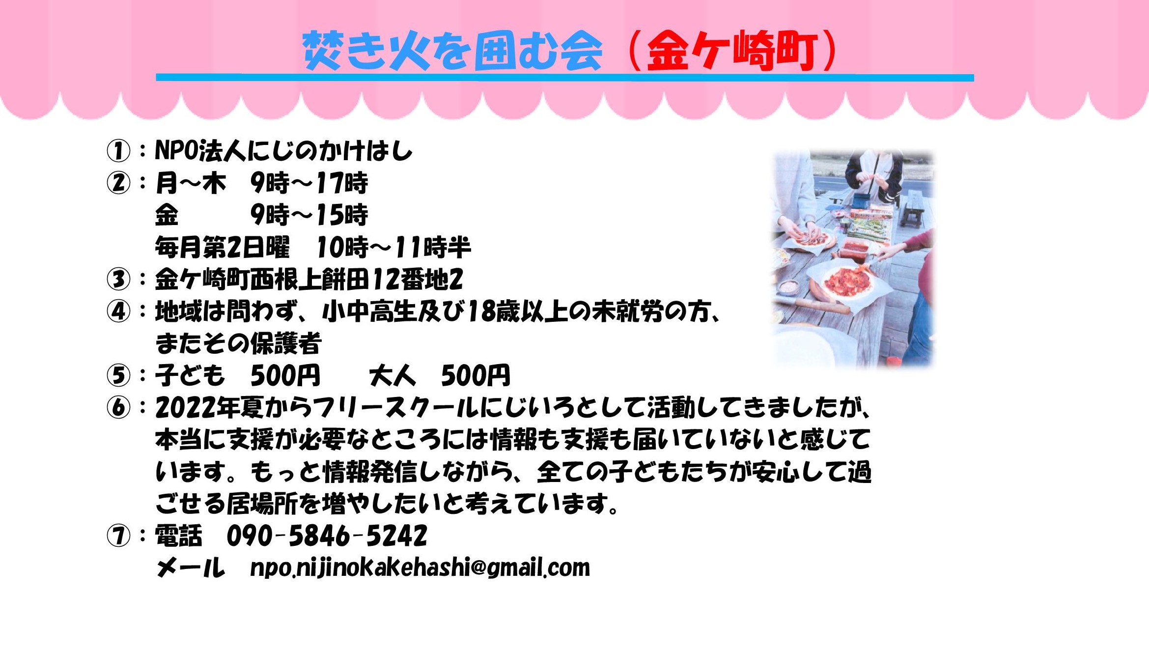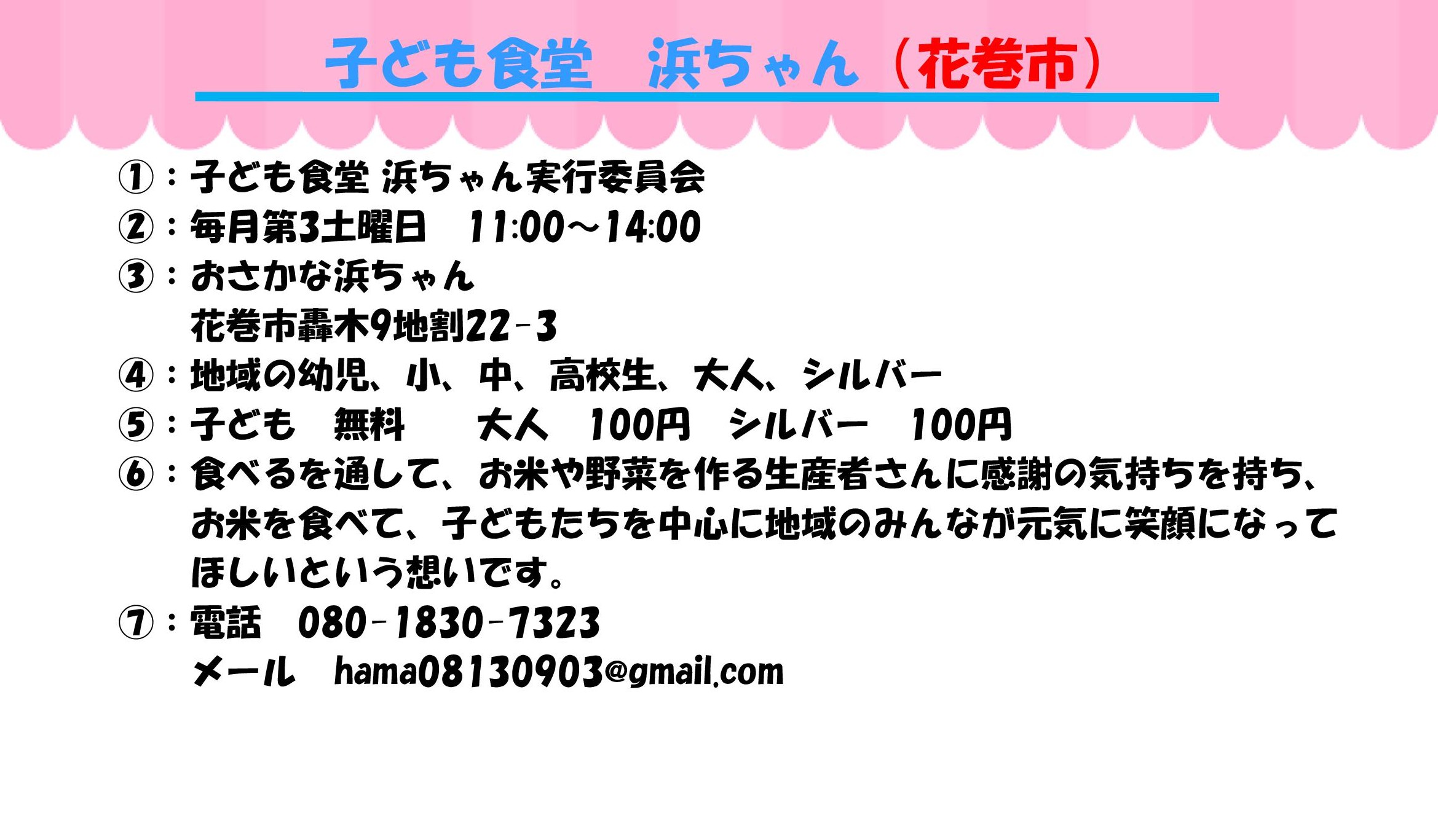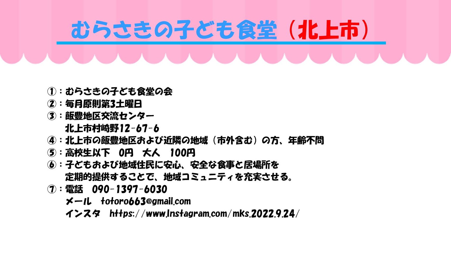 ①実施団体 ②開催日と時間 ③場所 ④対象 ⑤参加費 ⑥ひとこと ⑦問い合わせ