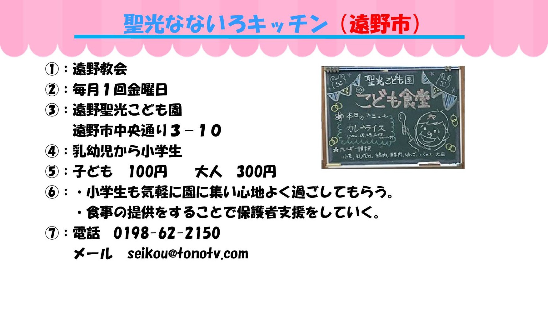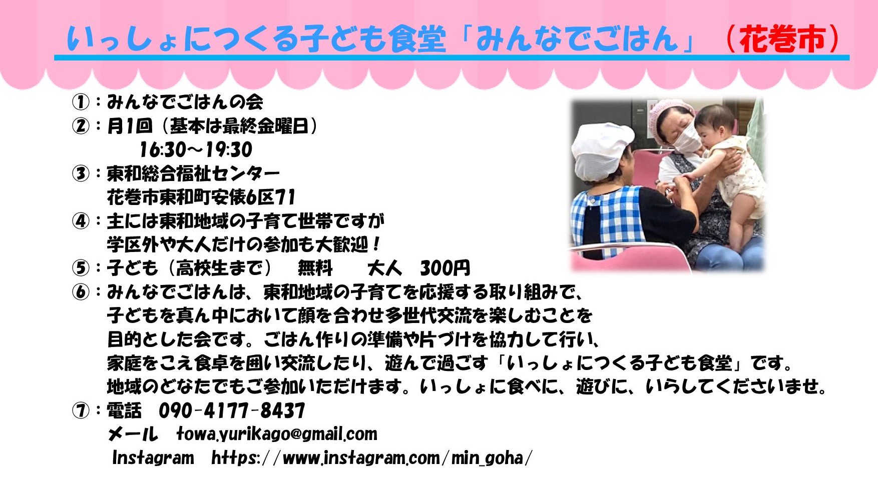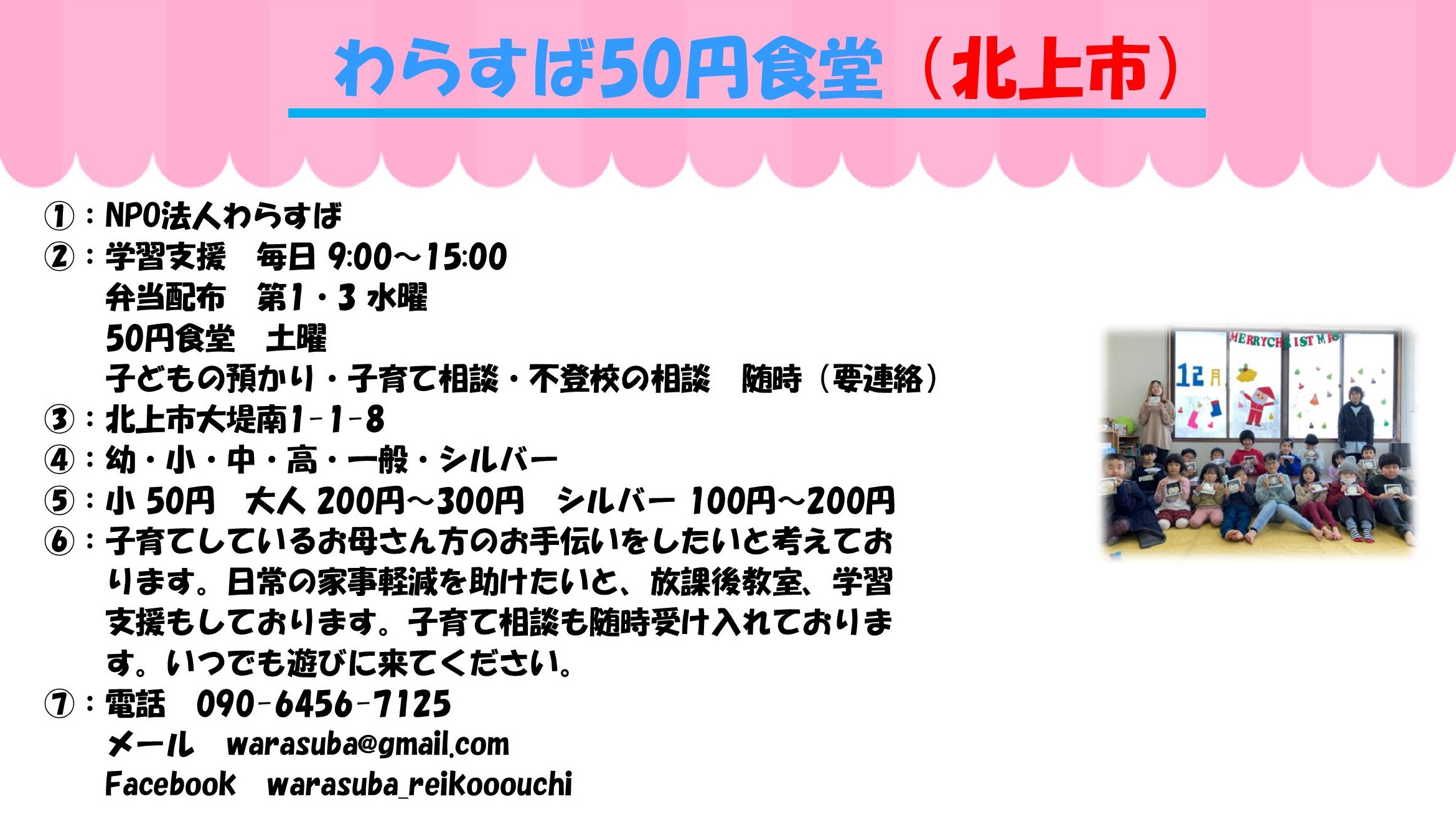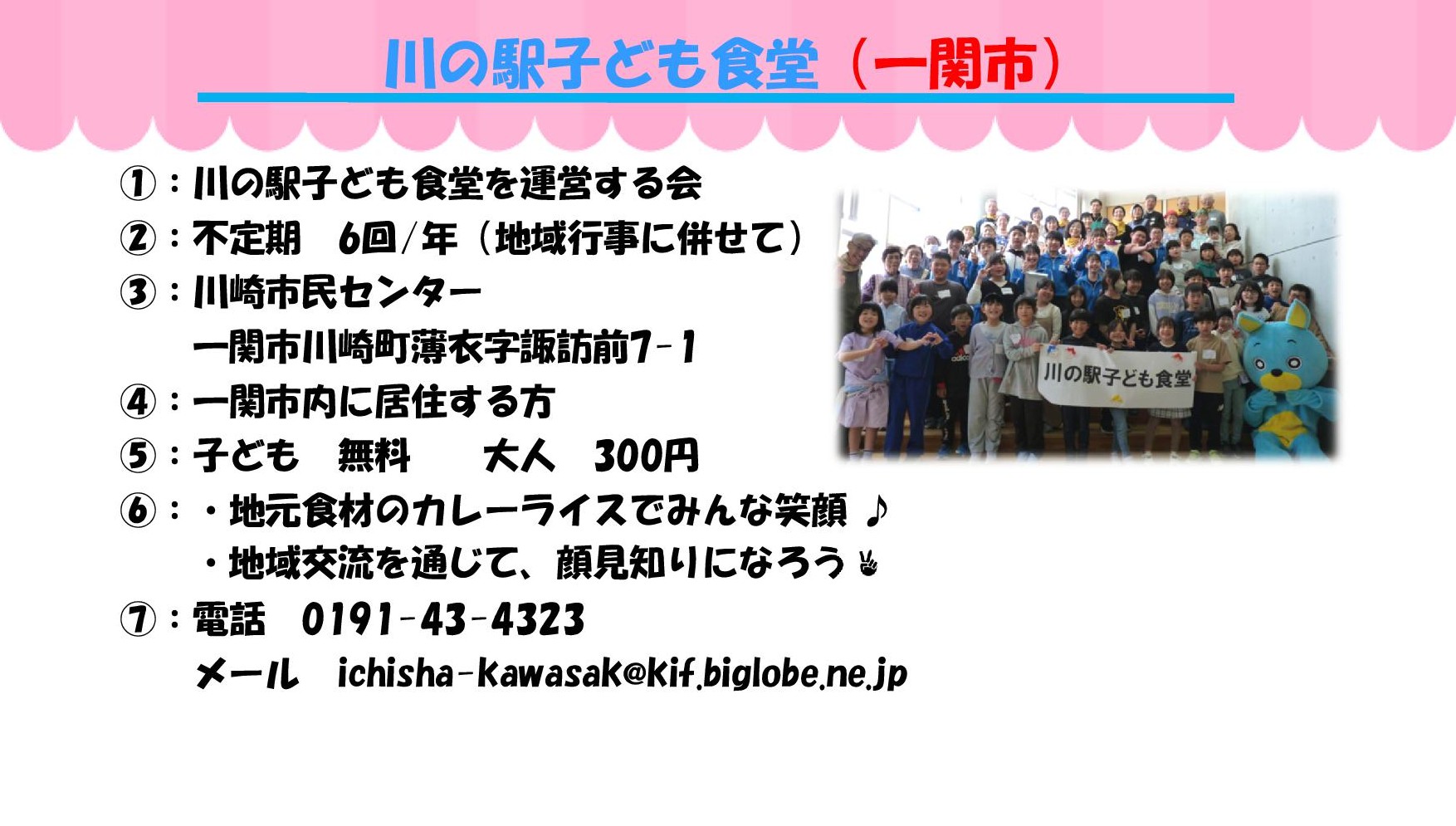 ①実施団体 ②開催日と時間 ③場所 ④対象 ⑤参加費 ⑥ひとこと ⑦問い合わせ