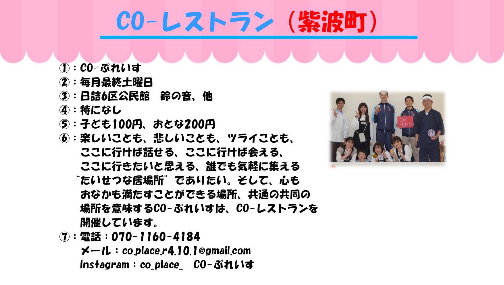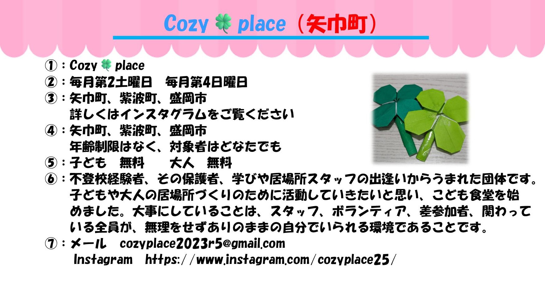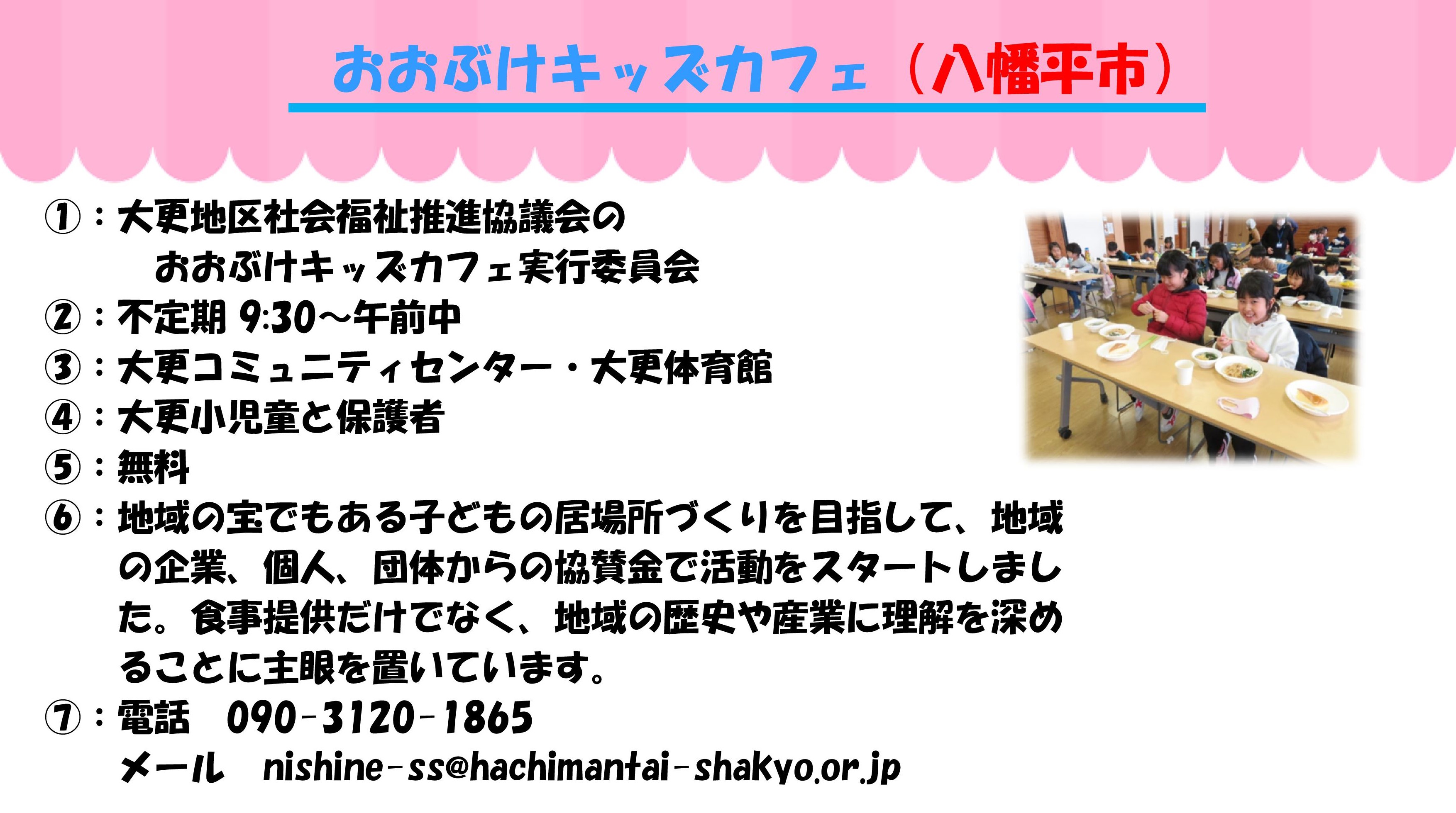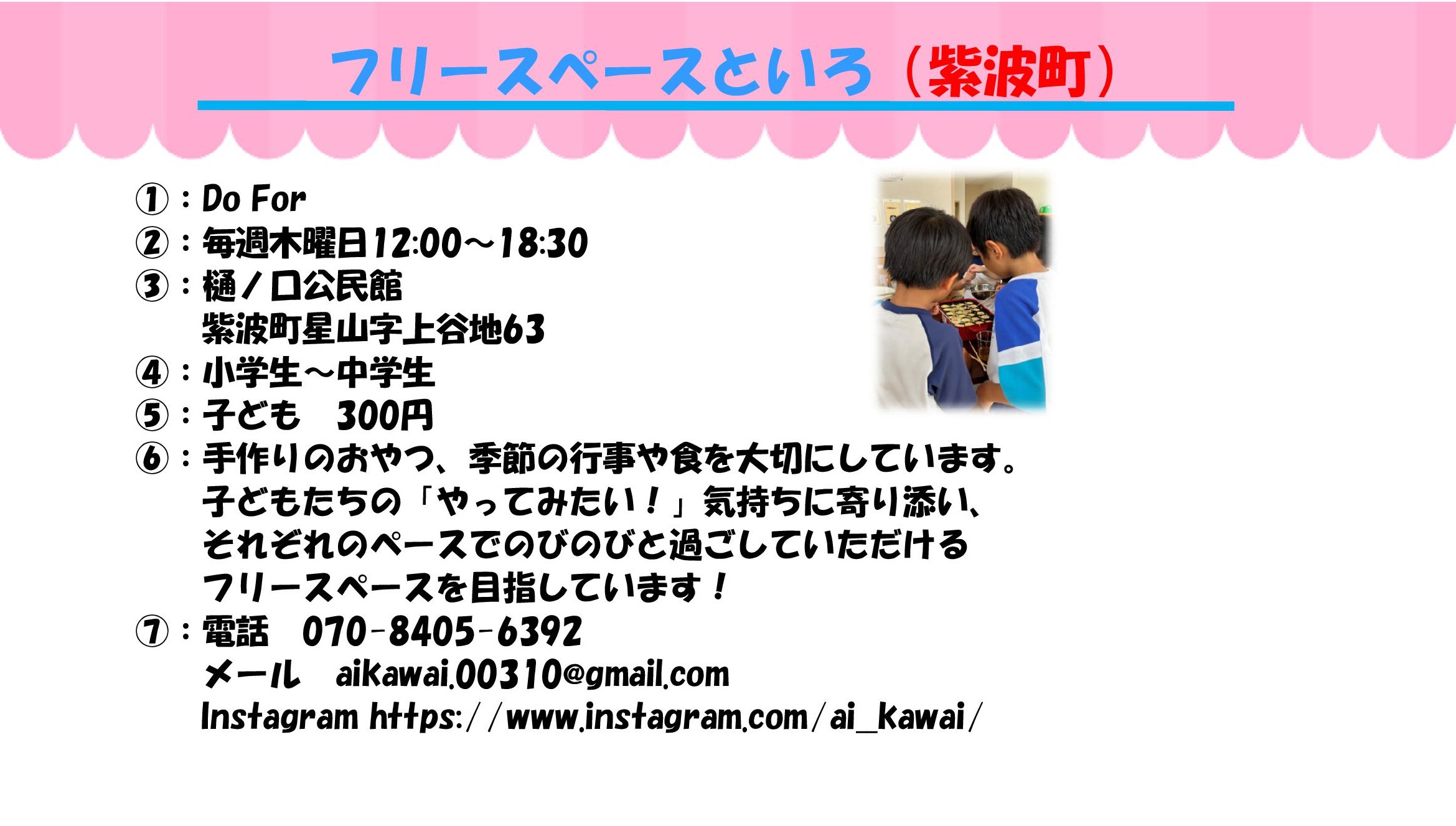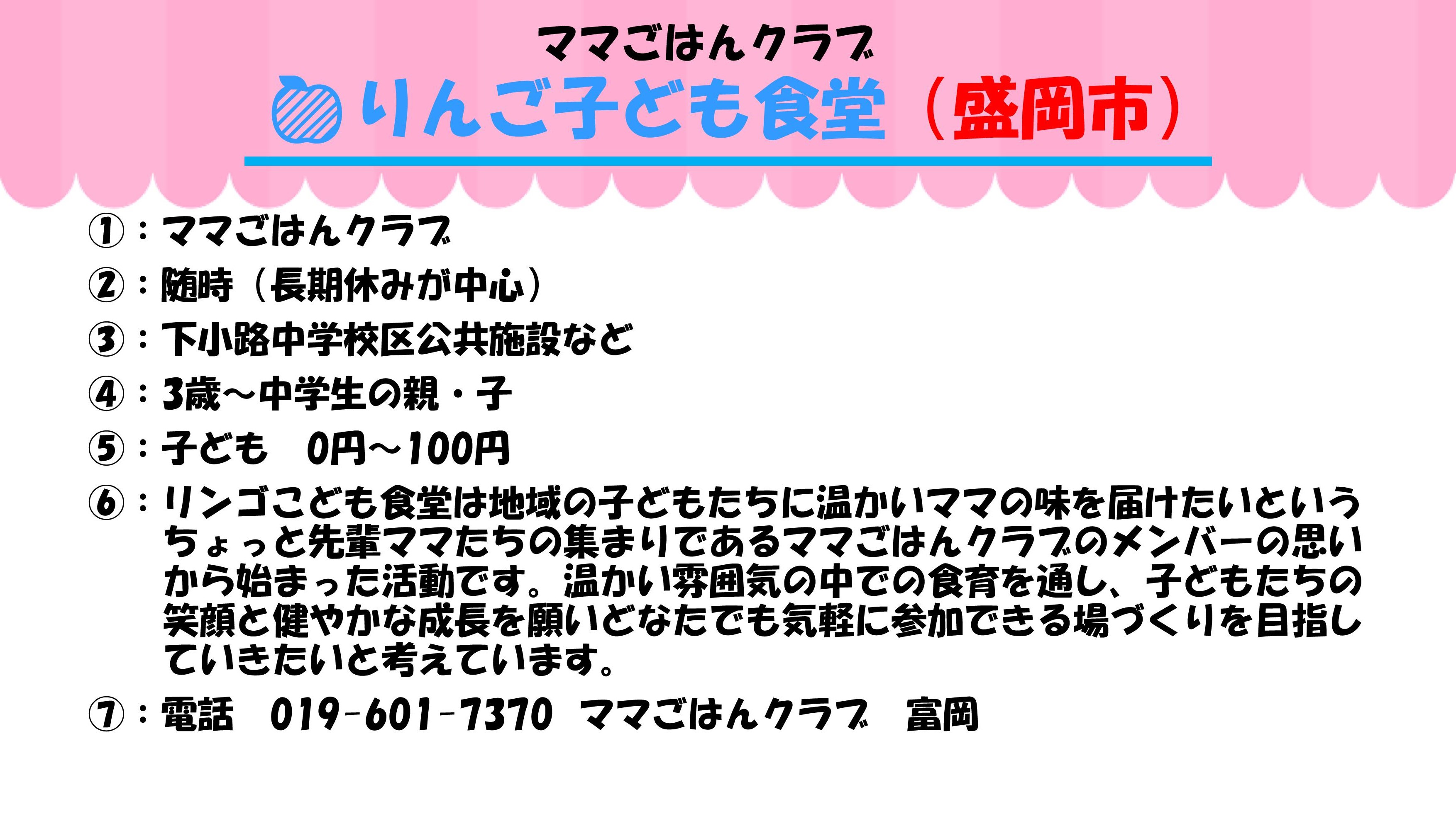 ①実施団体 ②開催日と時間 ③場所 ④対象 ⑤参加費 ⑥ひとこと ⑦問い合わせ