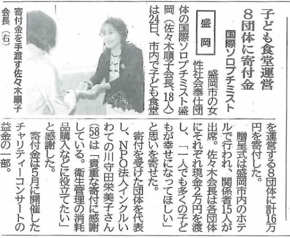国際ソロプチミスト盛岡様より、ご寄付をいただきました。